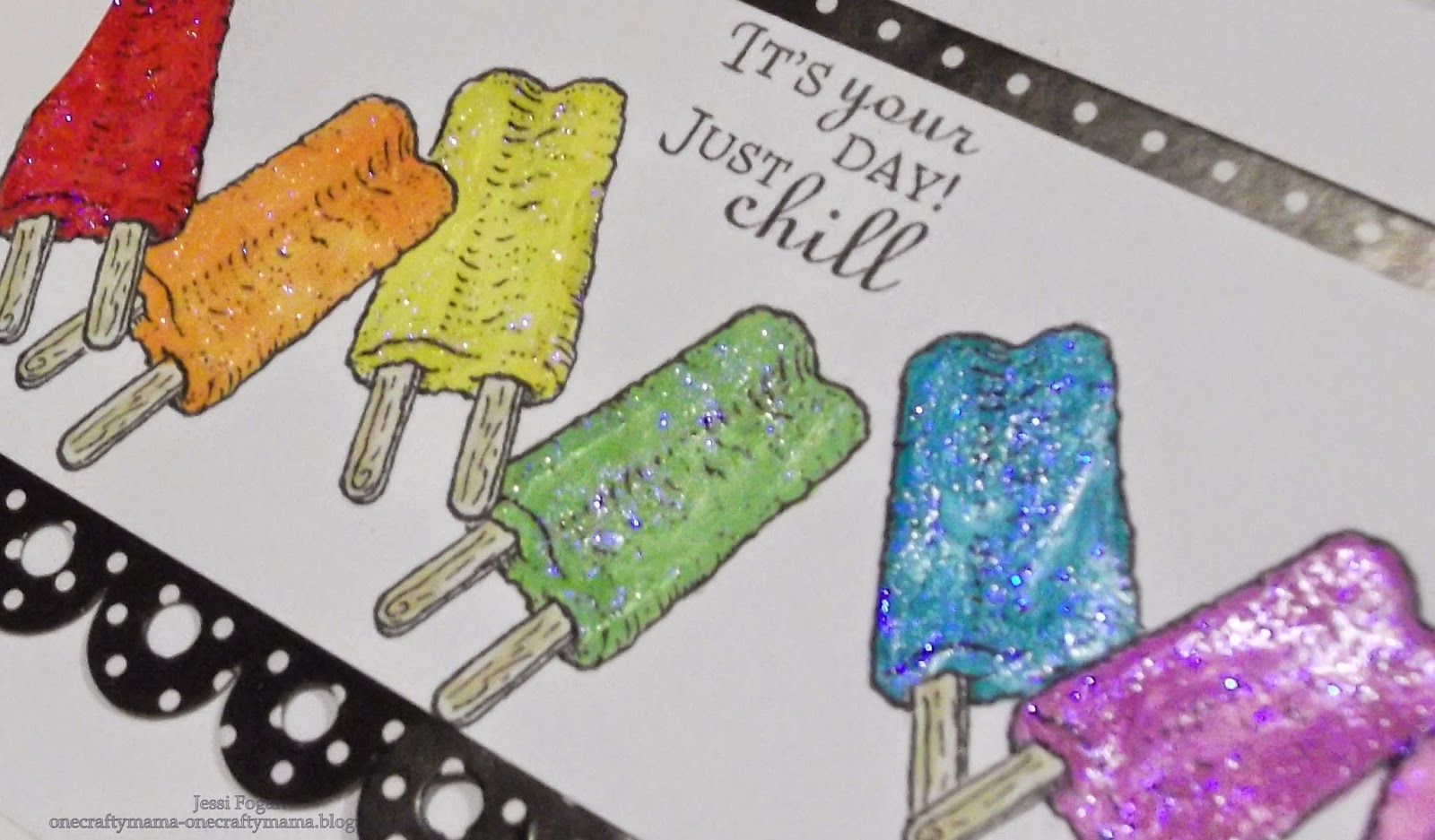 Some simple masking to line up the popsicles so they overlapped a little bit, and just one marker for each popsicle. I didn't bother trying to do any shading since I knew I was going to make them sparkly afterwards. I trimmed the Edger so that I could have a little border at the top as well. Once I assembled the card I added the glitter glue.