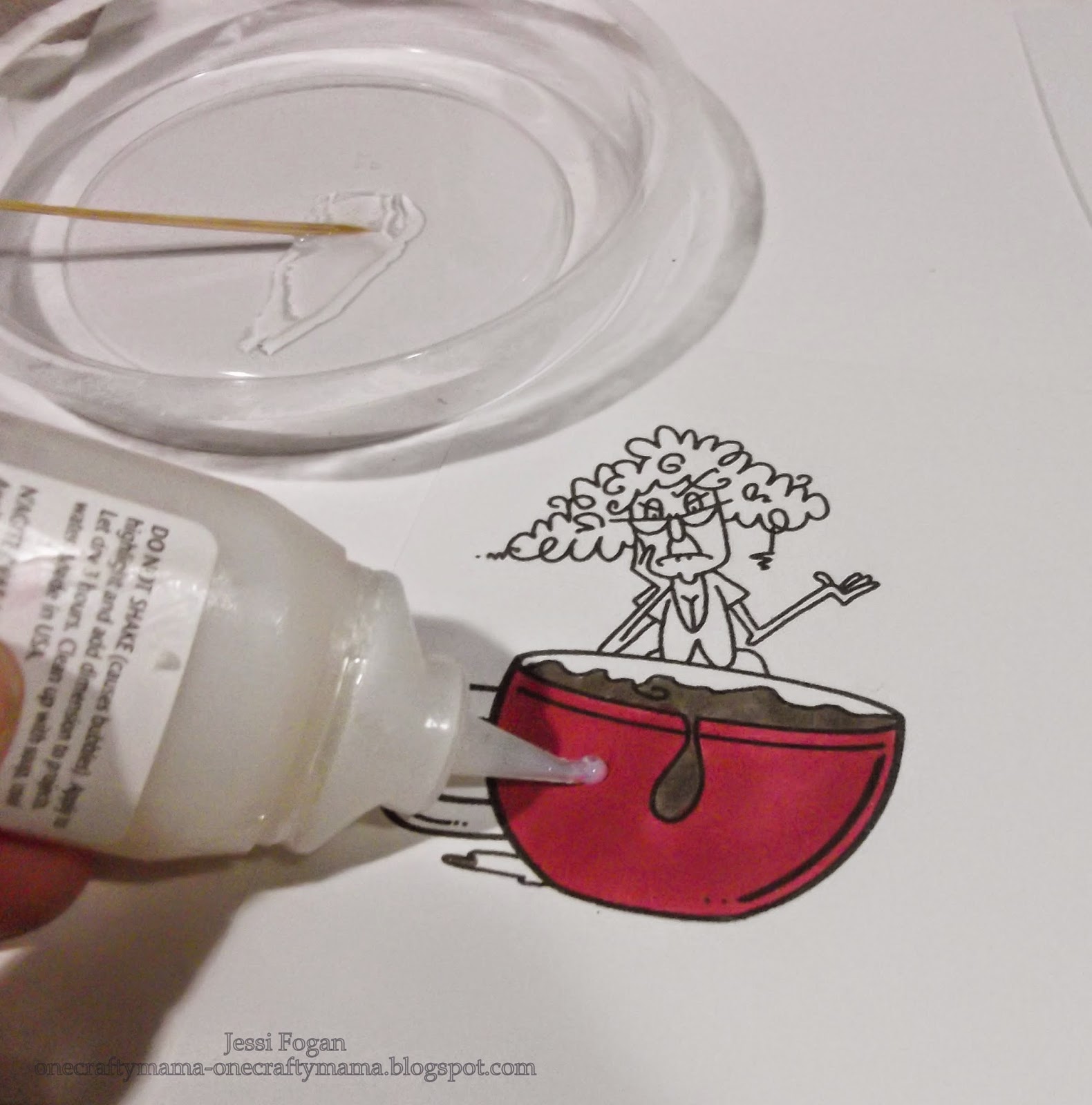 Now for the fun part! I use Mod Podge Dimensional Magic, but you can use any gloss medium (such as Glossy Accents). I save the plastic clamshell packaging from tapes, etc, to use as disposable glue and paint trays. You'll also need a toothpick!
