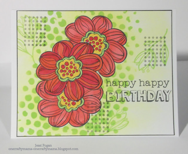 Supplies: STAMPlorations birthday sentiment; PTI 'dots' grid'; unknown floral stamps; Tim Holtz bubbles stencil; Twisted Citron & Mustard Seed distress ink; Memento Tuxedo Black ink; Copics & Sharpies