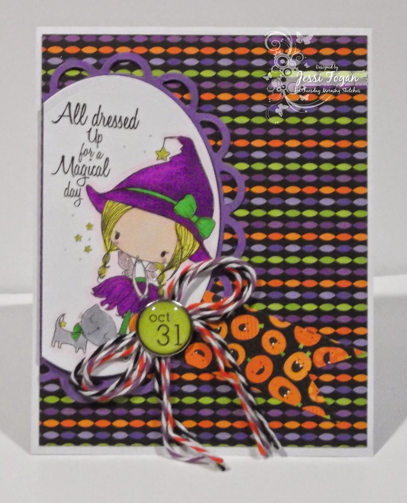 Supplies: A Magical Day digi stamp from All Dressed Up; brad & papers from MME; Spectrum Noir markers; sakura stardust glitter pen; timeless twine; classic small and lacy oval Nesties