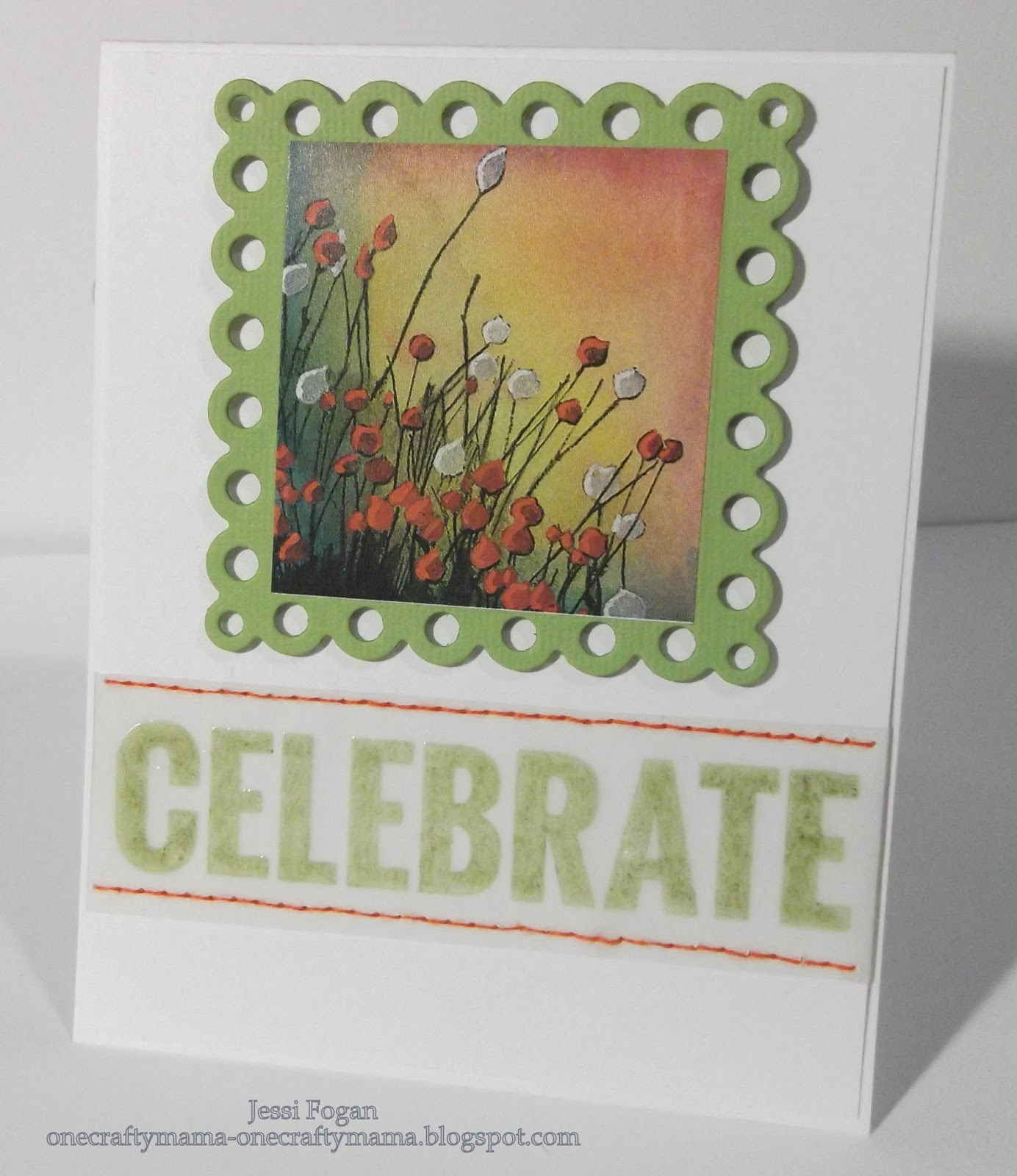 Supplies: Penny Black sticker; Reverse Confetti sentiment; Peeled Paint distress ink; Versamark & clear EP; square eyelet Nesties; embroidery supplies