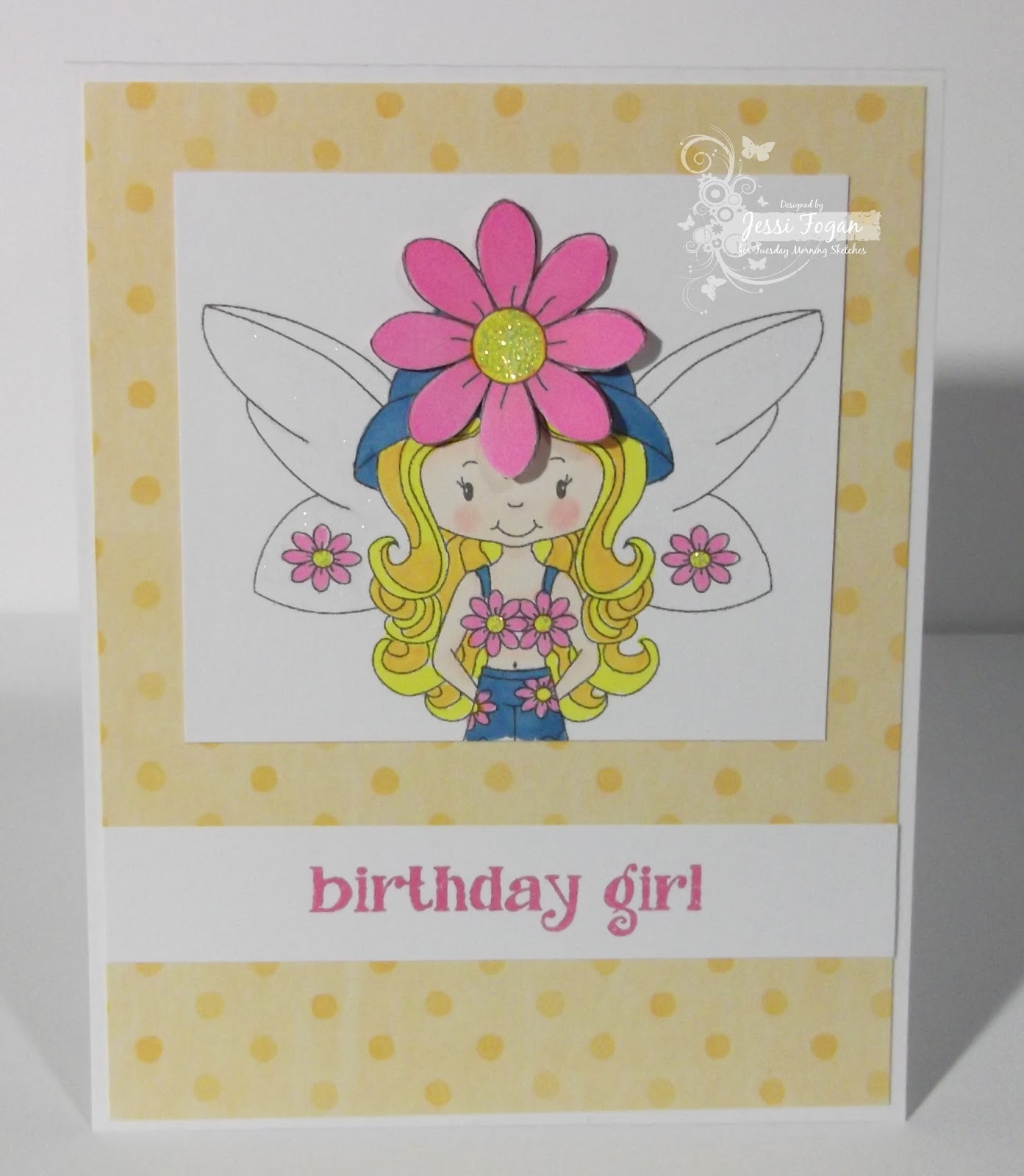 I printed 2 copies of the digi so that I could pop up the big bloom on her hat, and coated her wings with Wink of Stella for some shimmer. Perfect for a little girl's birthday!