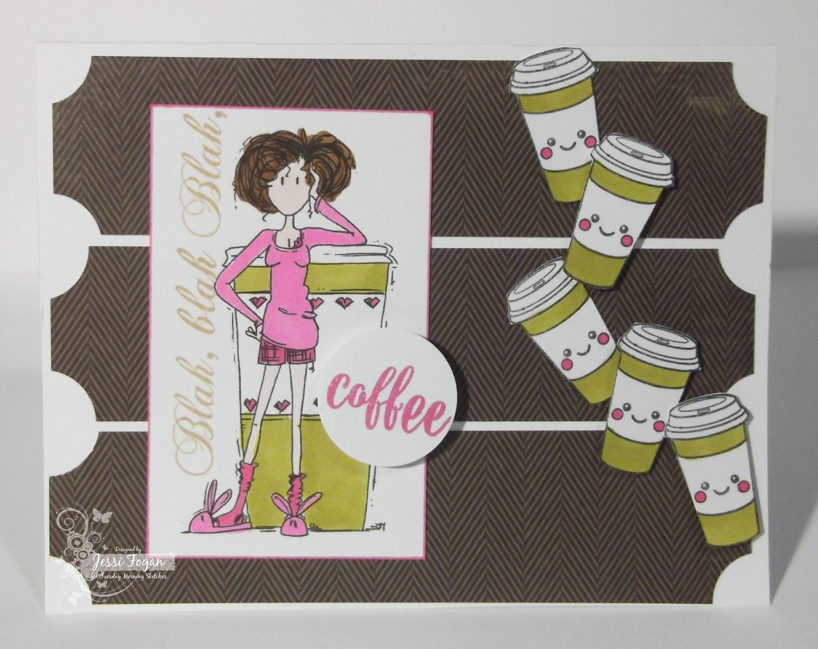 Supplies: Girlz Coffee digi from Bugaboo Stamps; 'blah blah' stamp from Rubber Dance; 'coffee' and coffee cups from Waltzingmouse Stamps; Memento Tuxedo Black ink; Picked Raspberry Distress ink; Kraft ink from PTI; Spectrum Noir & Sharpie markers; 1" circle punch; paper from MME